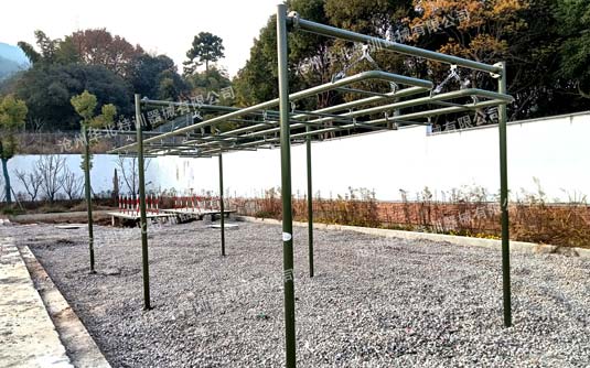 渡海登島400米障礙場(chǎng)為各國(guó)海軍日常訓(xùn)練科目之一,場(chǎng)地采用4次回轉(zhuǎn),共10個(gè)項(xiàng)目,依次為:軟橋、螺旋梯、高低橫木、繩網(wǎng)、輪胎攀臺(tái)、搖擺平臺(tái)、晃動(dòng)橫梯、跨網(wǎng)、阻絕墻、模擬沙灘。跑道分四道,其中三道障礙道,每道寬6米,一道模擬沙灘,寬2米。場(chǎng)地總體尺寸100米×20米?捎寐费朗鲋吔纭
