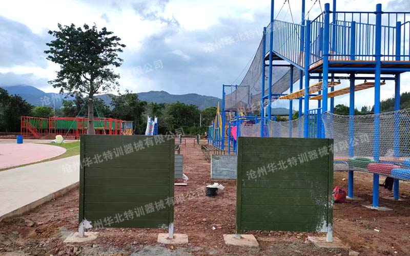 兒童國防軍事障礙單道場(chǎng)地長50米,寬2米。通常為雙道并列設(shè)置。項(xiàng)目依次為獨(dú)木橋、高欄、斜坡、地籠、矮墻、高板6個(gè)項(xiàng)目。