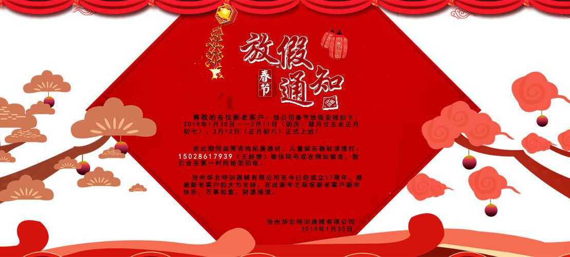 親愛的朋友,滄州華北特訓(xùn)器械有限公司的不斷成長得益于諸位長期以來的信任與支持。站在新的起點上,我們攜手2019年,凝聚我們力量,團結(jié)一致開創(chuàng)新的輝煌。最后,祝福大家春節(jié)愉快、身體健康、合家歡樂、豬年吉祥!