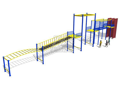 33.4米長×2.4米寬。最高點(diǎn)8米。平臺(tái)高度3.7米、3.4米 主要項(xiàng)目:壁虎墻、蕩木橋、蕩繩、輪胎組合、拱形橋。