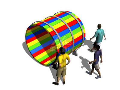 參訓人員站在桶內向前慢慢走動,利用身體重心的改變使?jié)L筒快速轉動。
