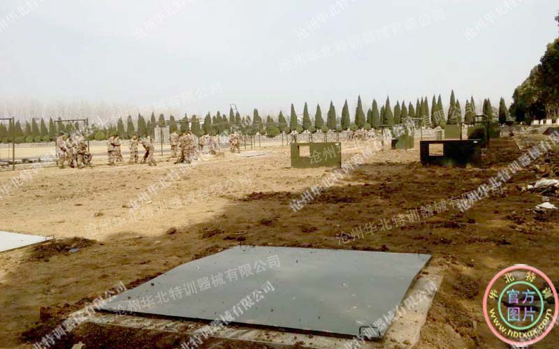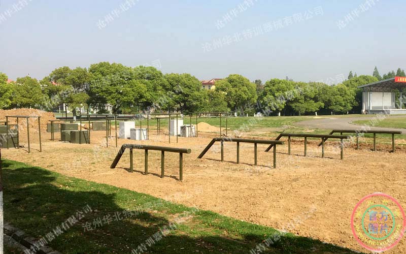 400米障礙設(shè)八組障礙,由跨樁、壕溝、矮墻、高板跳臺(tái)、水平梯、獨(dú)木橋、高墻、低樁網(wǎng)八組障礙物組成,場地兩端各設(shè)轉(zhuǎn)折旗一面。標(biāo)準(zhǔn)400米障礙場具體障礙位置設(shè)定為:轉(zhuǎn)折旗—5米—五步樁(4.6米)—5.4米—壕溝(2米)—13米—矮墻—15米—高板—1米—高臺(tái)—1米—低臺(tái)—0.3米—水平梯(4.81米)—10.39米——獨(dú)木橋(6.57米)—3.43米—高墻—10米—低樁網(wǎng)(5米)—2米—轉(zhuǎn)折旗。