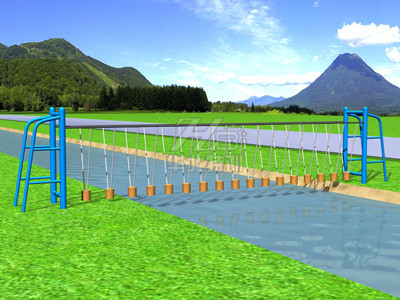 雙手緊握鋼鏈、腳踩在連接在鋼鏈下方的木樁上,利用木樁前后擺動不斷交換到對岸