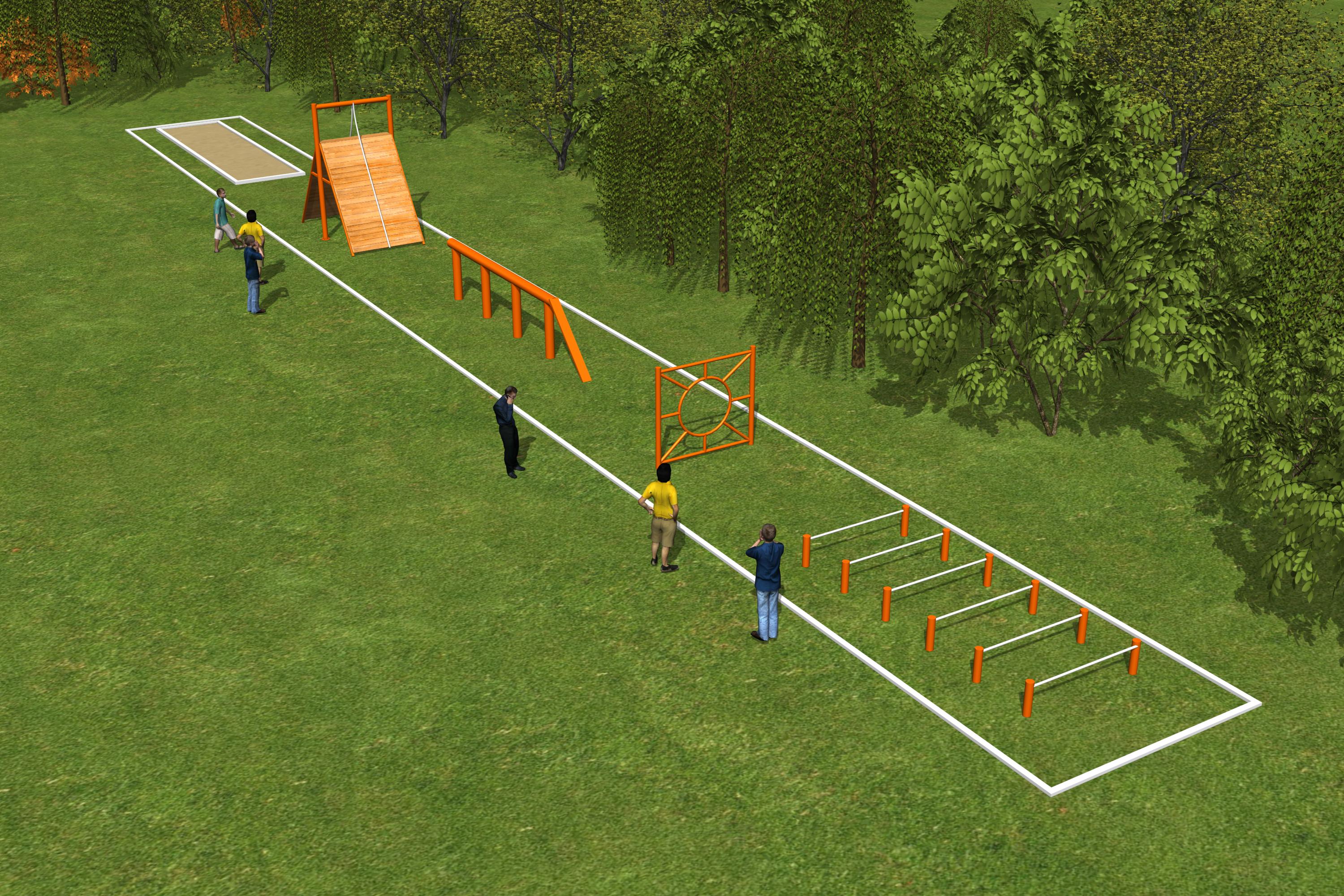 兒童國防軍事障礙賽單道場地長50米×寬2.5米。通常為雙道并列設(shè)置。項目依次為獨木橋、高欄、...