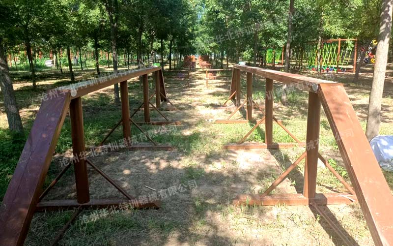 兒童國防軍事障礙單道場(chǎng)地長50米,寬2米。通常為雙道并列設(shè)置。項(xiàng)目依次為獨(dú)木橋、高欄、斜坡、地籠、矮墻、高板6個(gè)項(xiàng)目。