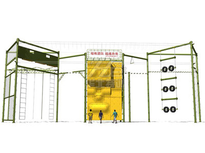 器械整體占地45.7米×9.86米×12米(高),最小場地需求49.34米×11米。 主要項目:攀巖、單杠、斷橋、天梯、蕩木橋、繩網(wǎng)、吊索橋、相互依存、叢林繩