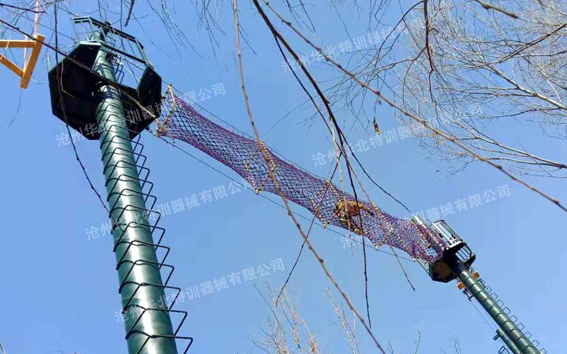 空中穿越項目是由叢林穿越項目延伸而來,它與叢林探險項目的區(qū)別在于不用考慮樹木之間的間距和樹木的承重?罩写┰巾椖渴峭ㄟ^獨立立柱來代替樹木的方法建設(shè),這樣立柱可以根據(jù)項目的間距和承重來確定立柱的大小,可控性比較高。
