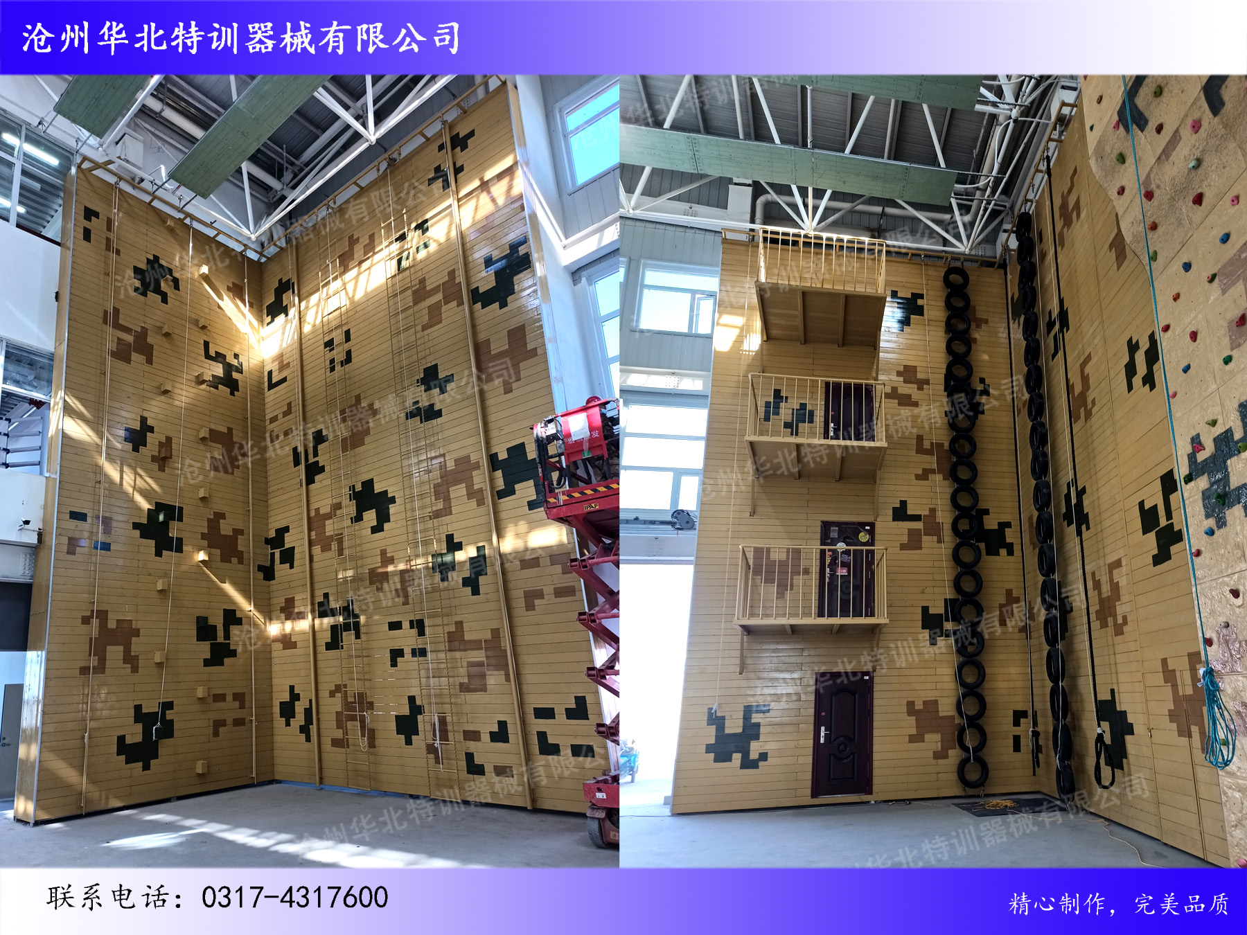 滄州華北特訓器械有限公司經(jīng)過近二十年的發(fā)展,合作客戶已經(jīng)覆蓋軍隊,武警,公安,司法,消防,邊防,教育,大中企業(yè),旅游景區(qū),休閑娛樂等多個行業(yè)。產(chǎn)品包括:高空拓展訓練器械(心理行為訓練器械),軍警拓展訓練器械,公安消防拓展訓練器械,地面拓展訓練器械,青少年素質(zhì)拓展訓練器械(重走長征路),水上拓展訓練器械,叢林探險拓展訓練器械 ,CS拓展訓練器械,安全裝備等系列產(chǎn)品,同時為客戶提供拓展訓練器械維護保養(yǎng),人員培訓,基地運營等多方面的培訓,期待與您合作:0317-4317600!