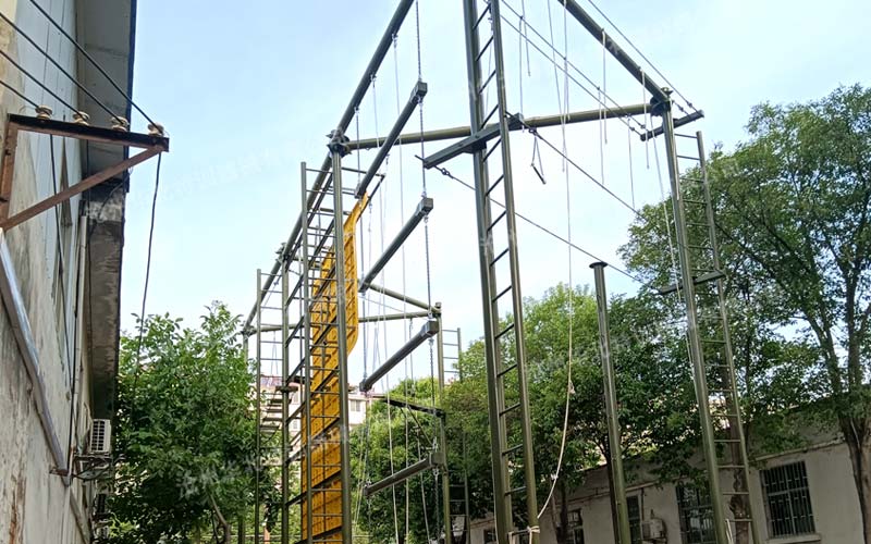 此高空組合訓(xùn)練器械總高9米,采用雙立柱單橫梁的組合形式,在滿足訓(xùn)練需求和器械穩(wěn)定性的前提下減小占地面積。